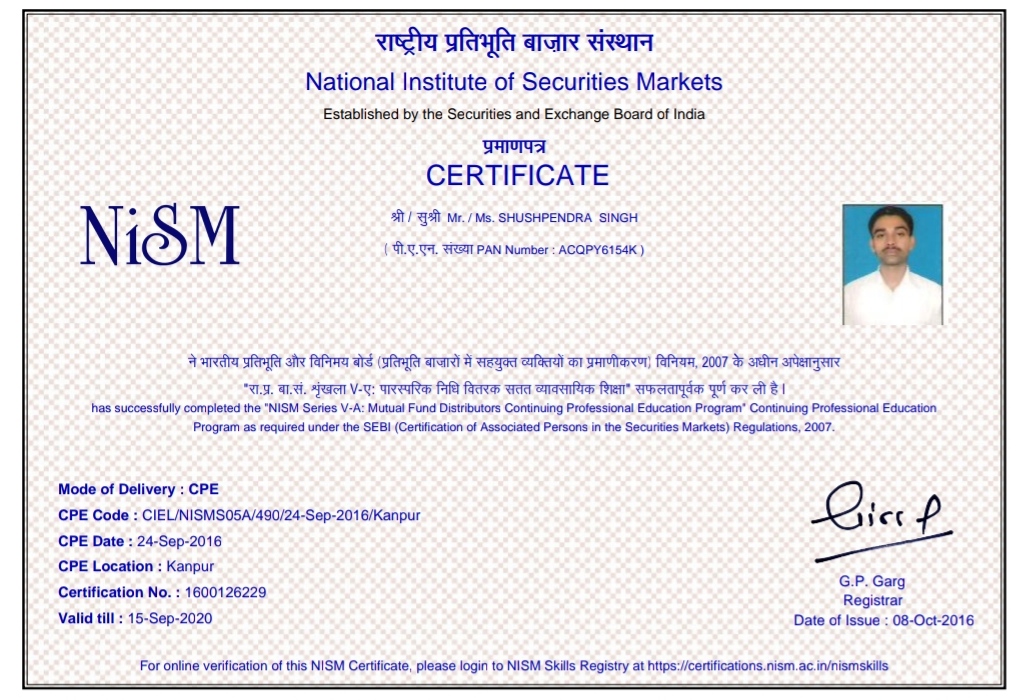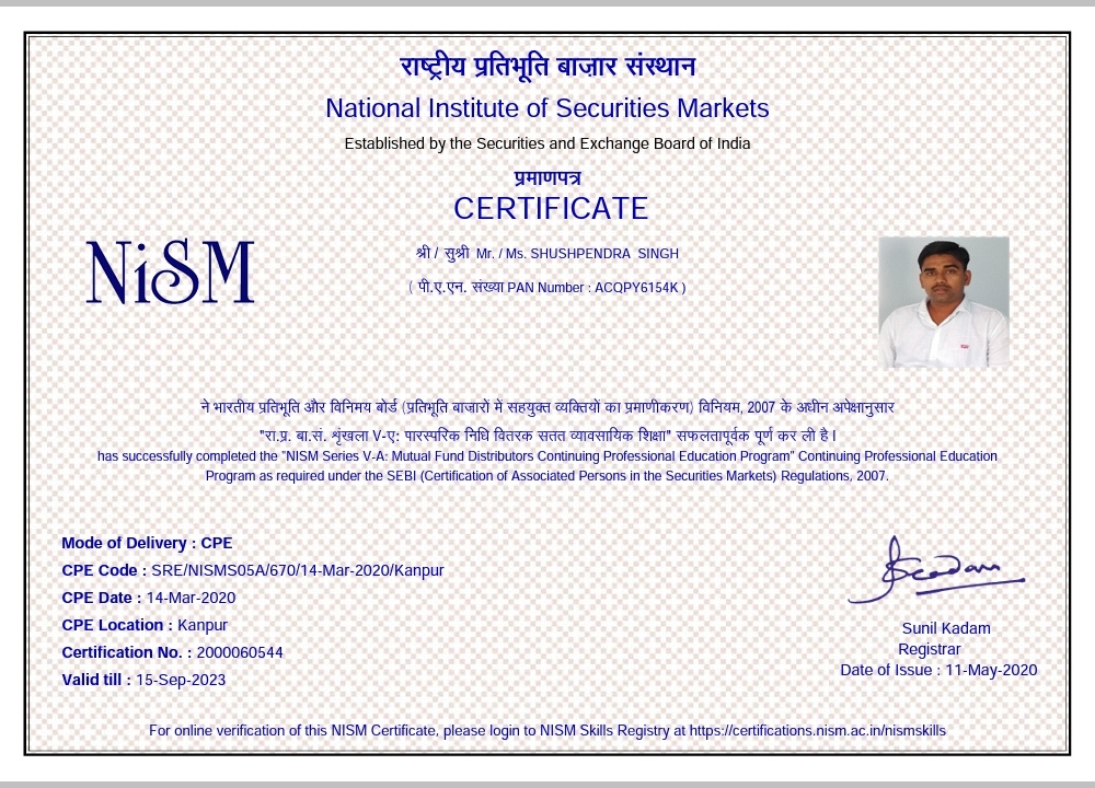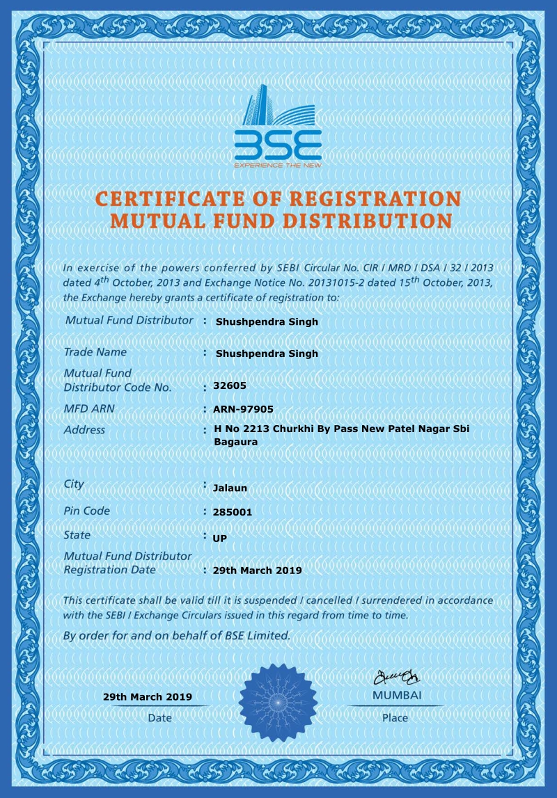 Shushpendra singh a financial adviser for Mutual Funds registered with AMFI, which had been providing similar services to the satisfaction of its clients. Shushpendra singh offers a wide array of products and services, including integrated Financial planning, Wealth management, Tax Consulting services, Insurance & Mutual Funds. Shushpendra singh serves over 500 clients, high net worth families and individuals and retail investors.